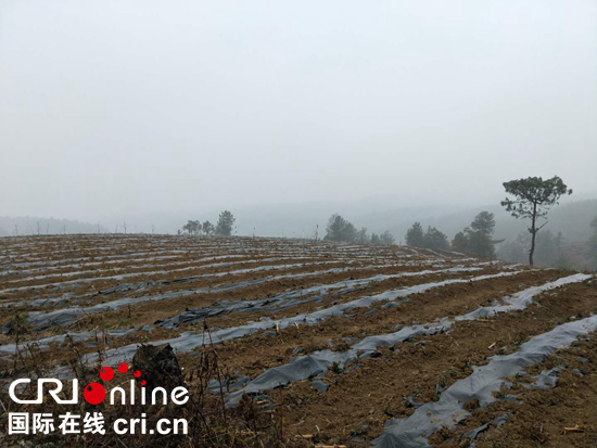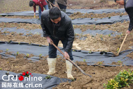 2018年2月9日的茶产业基地,天气比较寒冷,茶农的工作热情却丝毫不减。他们正在小心翼翼地为茶苗覆上薄膜。46岁的农户周礼尧就是其中的一员,他一边工作一边说道:“我就是杨家湾镇开林村的,我们一家六口人,四个人都在这里工作,一个人一个月可以挣3000块,比以前种玉米挣赚钱多了。”