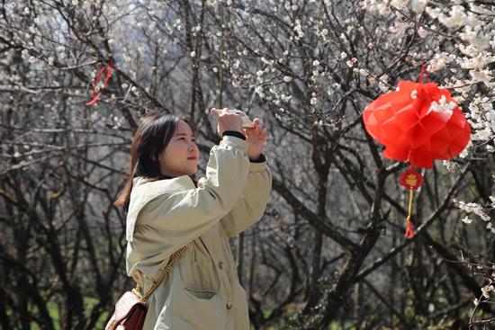 一朵梅花寓五福,一山梅花贺新春。梅原景区里,游客们或赏花祈福、或拍照打卡,尽情享受赏梅乐趣。