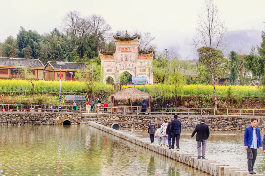 穿过石牌坊,一望无际的油菜花如海浪般袭来。游客们在花田小径里驻足赏花、拍照留恋,尽情徜徉于花海之间。