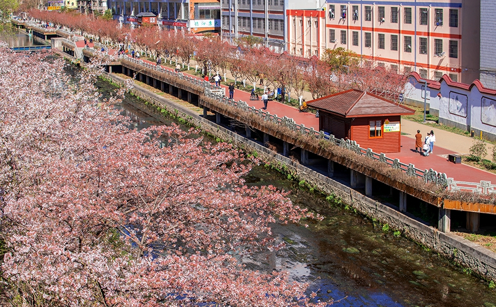 春分过后,有着“中国凉都”美誉的六盘水市中心城区的钟山区水城河边樱花竞相开放,景色怡人。