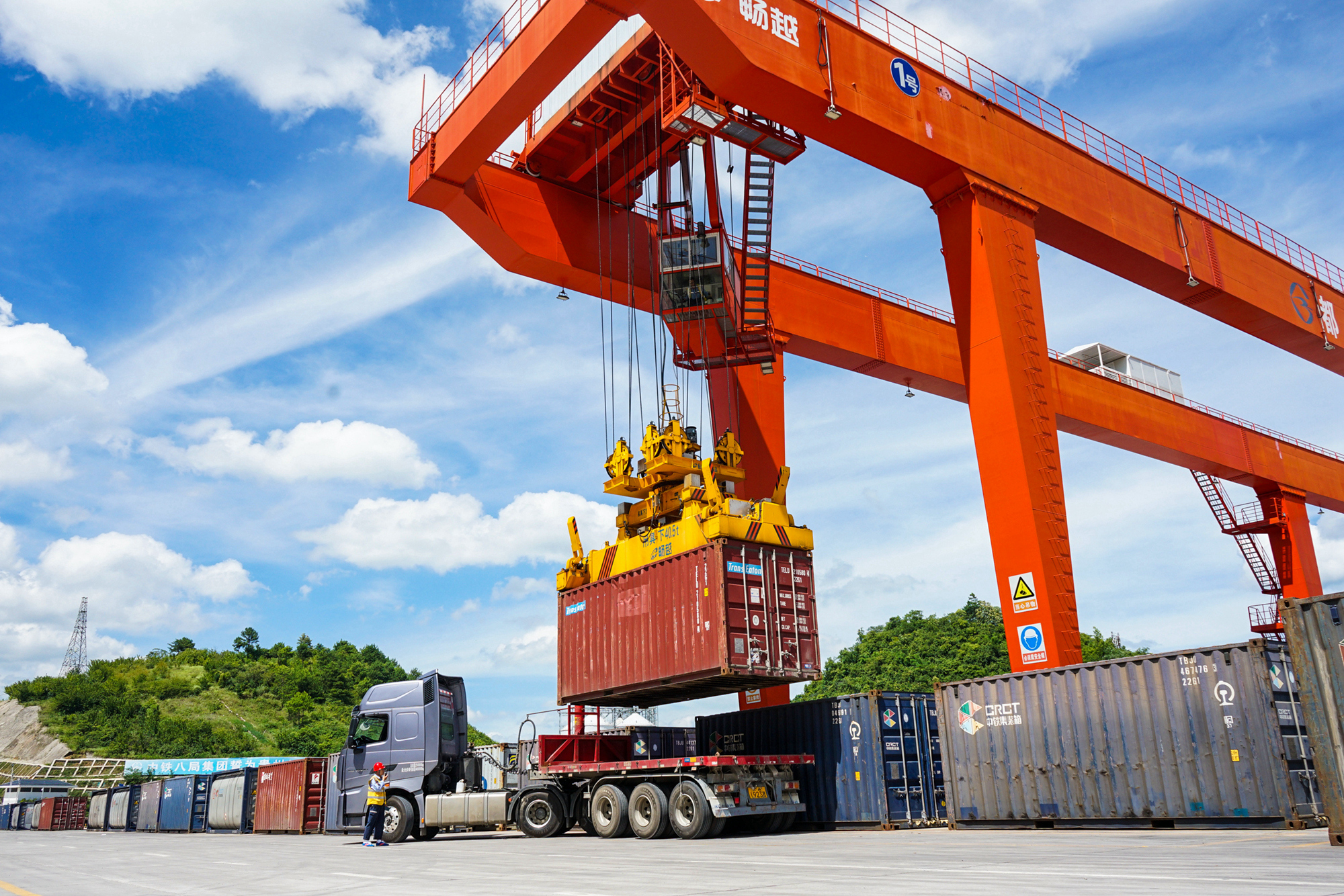 贵阳国际陆港内的巨型龙门吊正在对集装箱进行装卸。(贵阳综保区供图)