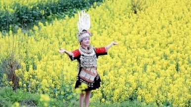 春风送暖,百花争艳,有着“天下苗族第一县”美誉的贵州省黔东南州台江县迎来万亩油菜花盛放期。
