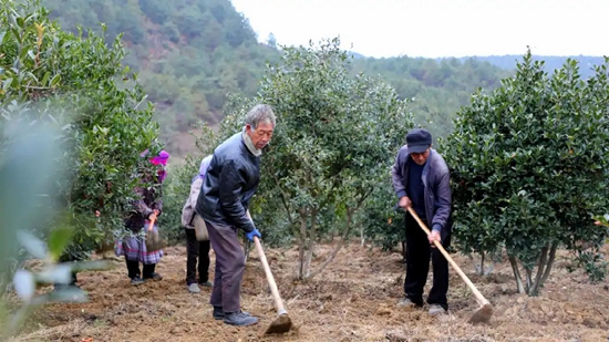 眼下正值油茶树管护的关键时节,在贵州省毕节市威宁自治县林业技术推广站油茶示范种植基地,一株株油茶树迎风而立,务工群众忙碌地进行冬季管护工作。