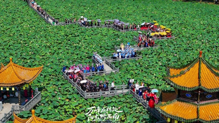 在安龙县招堤景区,秋日残荷与垂柳古亭相映成趣,国庆音乐节激情开唱拉开夜间文艺演出大幕,灯光璀璨、人潮涌动。安龙县以“加油之旅·荷您同行”为主题开展一系列文体活动,假期累计接待游客35.67万人次。兴义市万峰林景区聚焦“资源、客源、服务”三大要素,在万峰林峰潮集布局50多个特色商铺与20个临时摊位,汇聚本地小吃、非遗手作等多元业态。景区还精心举办年代主题沉浸式快闪秀、“峰林杯”街舞大赛等活动,从白天到夜晚为游客提供不间断的精彩体验。