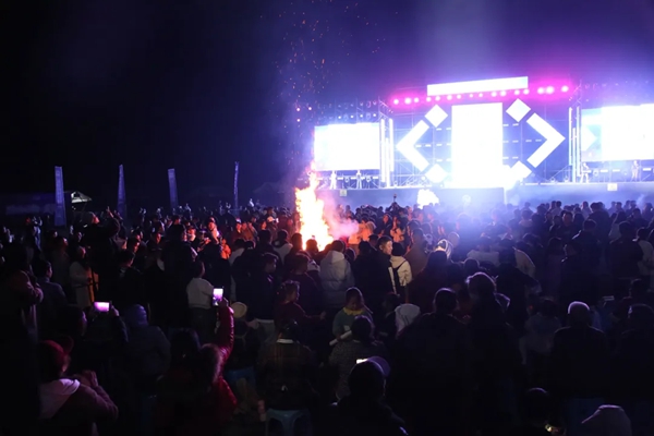 夜幕下的神泉谷景区火光璀璨,歌谣伴随DJ旋律响起,玩火表演与电音舞台灯光交相辉映,华语电音先锋艺人轮番登台,动感节奏与观众欢呼声交织成热烈的狂欢盛宴。
