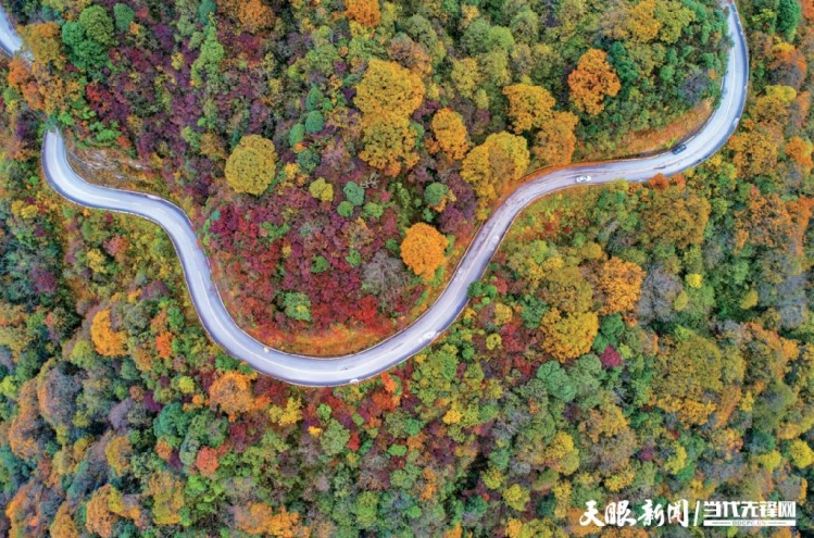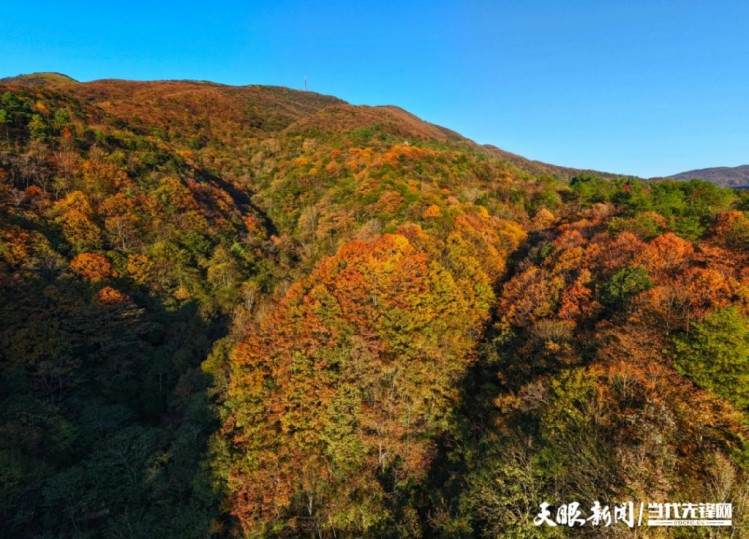 从高空俯瞰,大地仿佛铺开了一幅巨大的织锦,红、黄、绿相间的树木交织点缀山间,宛如大自然打翻的调色盘。成片的青冈树叶犹如锦缎,红色、黄色、青色、蓝色和紫色,调配出丰富色彩,染尽层林。