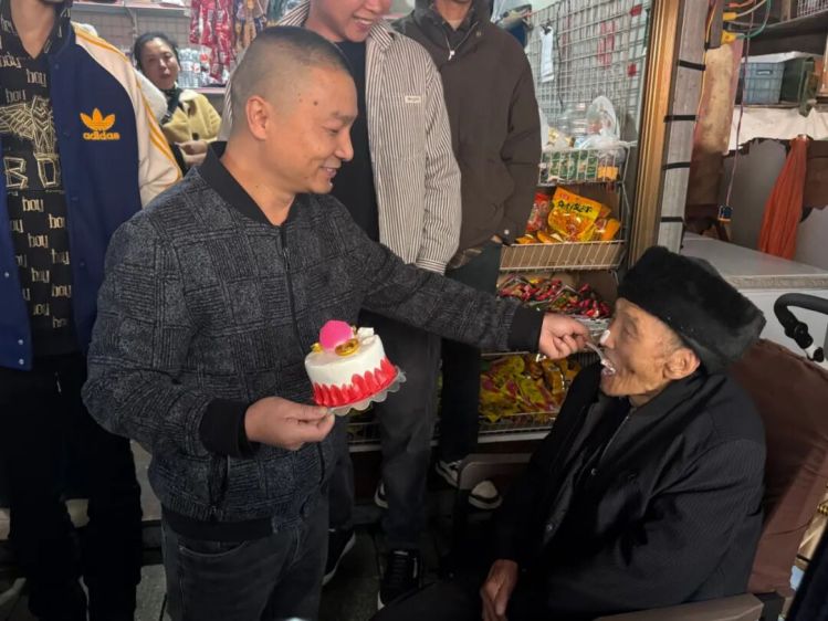 得知刘光权老人百岁寿宴“弃礼金、重祝福”的做法后,山奇社区工作人员专程带着印有“福如东海寿比南山”的12层定制寿糕登门祝贺。