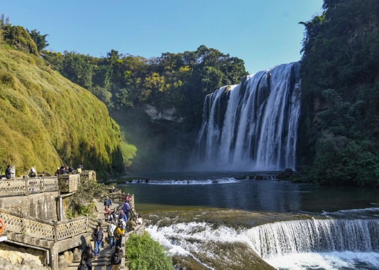 11月25日,冬日里的黄果树大瀑布褪去丰水期的喧嚣,水流似银色绸缎倾泻而下,在暖阳下泛着粼粼金光,尽显静谧壮阔的冬日韵味。景区内游客接踵而至、络绎不绝,随处可见驻足赏景、拍照打卡的身影。