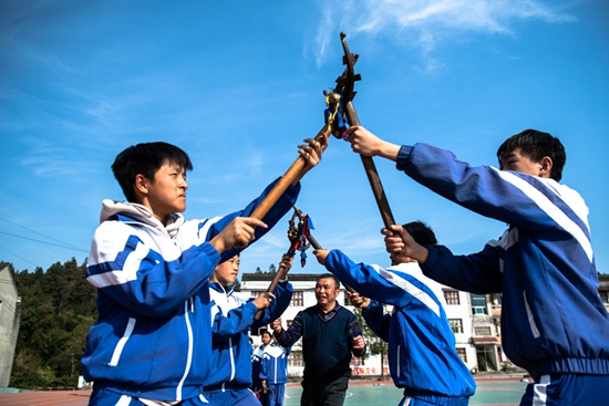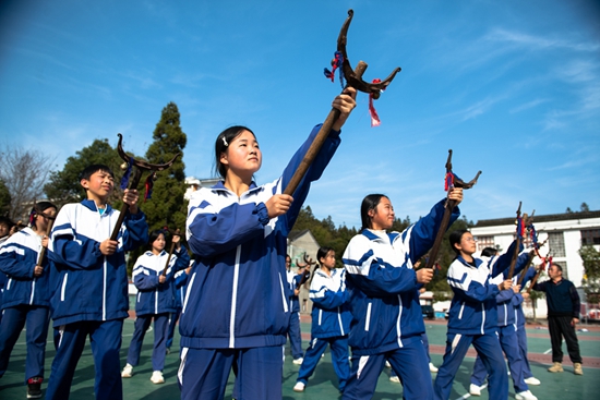 月牙镋是有170余年传承历史的古老兵器,曾用于防御野兽、守护家园,2006年被列为省级非物质文化遗产。如今,它从田野山间走进了校园课堂。为落实“双减”政策,传承民族文化,天柱县将月牙镋等非遗项目引入校园,聘请传承人授课,成立兴趣社团。