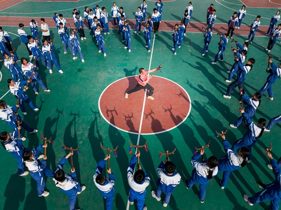 课间时分,高酿中学的操场上学生们闻鼓而动。他们手持状如弯月的月牙镋,转身、扫镋、对打,一招一式,刚柔相济,赢得围观者的阵阵喝彩。学生们扑、拿、击、刺,动作威猛,呼呼生风。这场武术与舞蹈于一体的表演,赢得了围观者的阵阵喝彩。