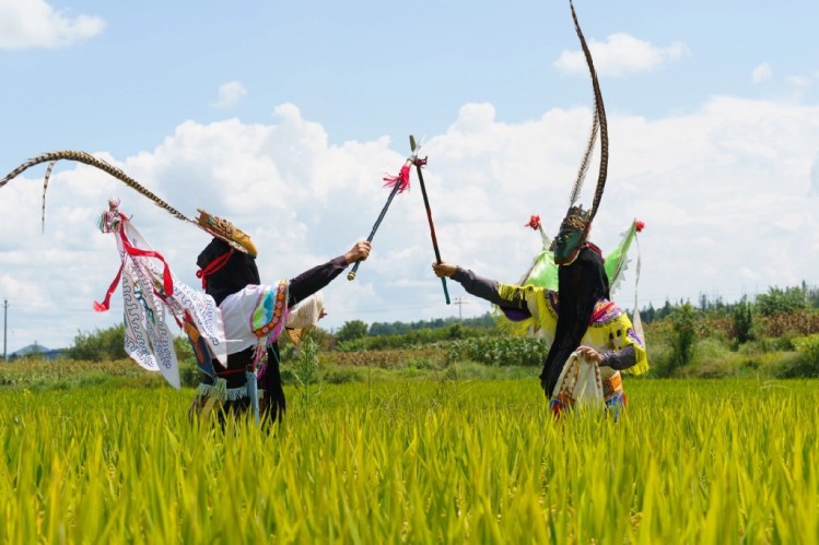 地戏艺人用屯堡地戏“跳米花神”展现丰收的喜悦之情。何晓璇 摄