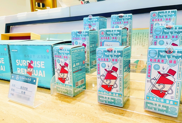 酱香黑啤和酱酒盲盒,成了这里的畅销品。年轻人王远鹏尝了一口黑啤,有些惊喜:“酱香和麦香融合,口感很特别。”旁边的盲盒货架上,摆放着可随机抽取小瓶酱酒的产品,甚至可能“开”出茅台酒。“这种玩法新鲜,让我们也愿意接触酱酒文化。”他说。