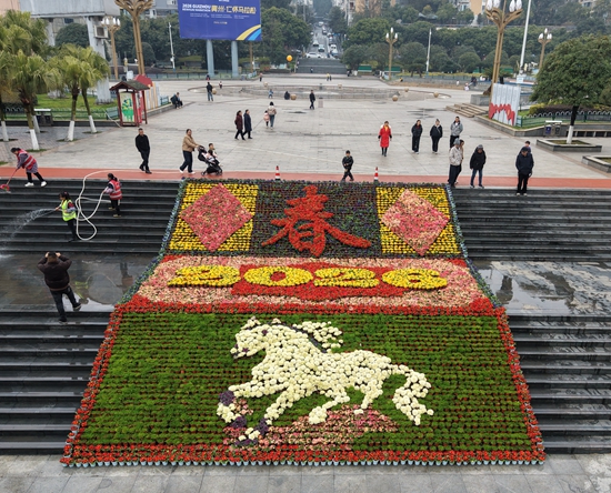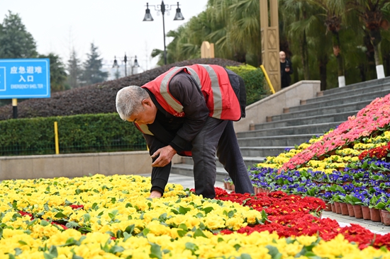 在仁怀市政广场,工作人员正有条不紊地将一盆盆鲜花搬到指定位置,并按照图纸上的字样进行精心摆放,红色的报春红、金黄的报春黄、娇艳的杜鹃花相互映衬,营造出浓浓的节日氛围。
