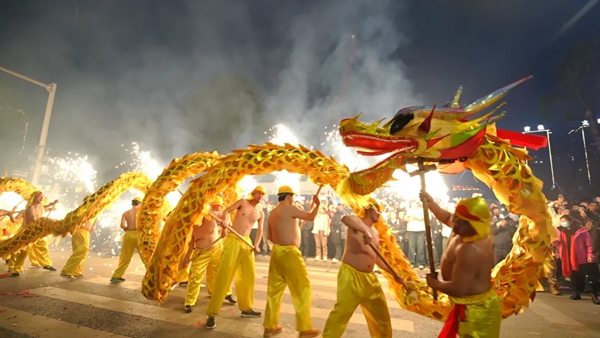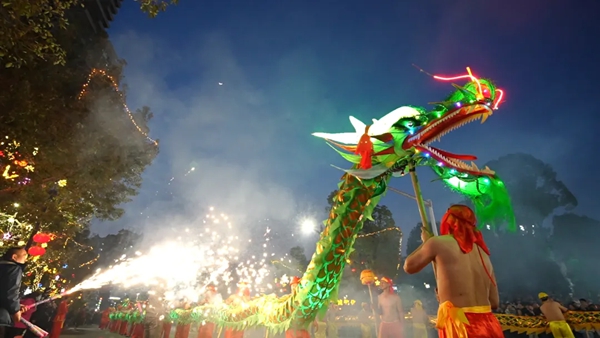 随着夜幕降临,华灯初上,黄龙、青龙亮起璀璨的灯光,在赤膊上阵的舞龙队员们手中“活”了起来。伴随着铿锵有力的锣鼓节奏,黄龙、青龙时而昂首向天、时而俯冲而下,在人群中蜿蜒游走。两条龙追逐着前面的宝珠,每一个动作都引得围观的群众发出阵阵喝彩与惊呼,现场氛围十足、人气爆棚。