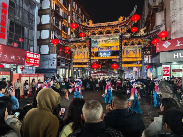 3月3日晚,“鸿运当头·乐宵遥”元宵民俗喜乐会在贵州省黔南州都匀市石板街热闹上演。