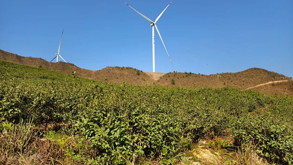 春回大地,万物复苏。近日,贵州省黔南州平塘县平舟镇摆克村3000亩凉伞石茶园春意正浓,粉色樱花与翠绿茶园、旋转风机构成了独特景致,吸引游客前来赏景、“采春”,感受茶山春色。
