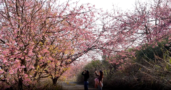在茶园蜿蜒的产业路两旁,2万株樱花树在春日暖阳里静静伫立。粉色花朵在蓝天的映衬下,多了几分婉约与诗意。“今年气温回升比较早,樱花是在2月中旬左右陆续开的,每天来打卡、赏花的都是在四五百人左右。”平舟镇摆克村党支部书记莫荣遮说。