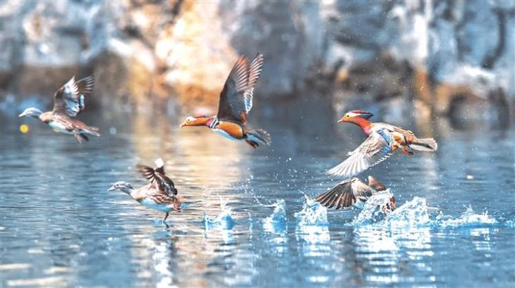 一群野生鸳鸯飞抵铜仁天生桥大峡谷国家湿地公园。 伍卫东 摄 (影像贵州)