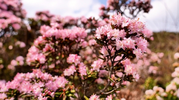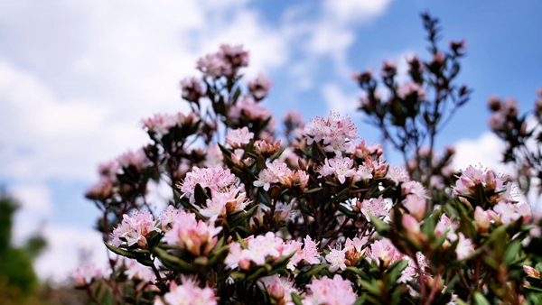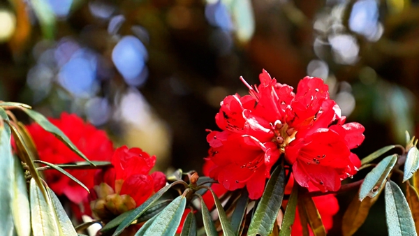 除了柔美的粉白花海,还有引人注目的红色大杜鹃。碗口大的花朵簇拥枝头,在阳光下熠熠生辉,一团团、一簇簇,如燃烧的云霞跌落人间,展现出高原花卉特有的生命力与野性之美。
