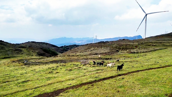 远山之上,悠然漫步的牛羊和马儿与缓缓转动的风车相映成趣。蓝天白云之下,青山绿水之间,漫山杜鹃随风摇曳,共同勾勒出这片广阔草原独有的春日画卷。