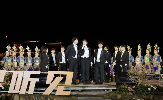 当晚,“大鸾和鸣·天地交响”文化交流专场晚会在肇兴侗寨拉开帷幕。Whiffenpoofs合唱团、贵州村歌团、侗族大歌艺术团、剑河村歌团、黄岗男声侗族大歌队、飞越彩虹栽麻侗族童声合唱团等多支队伍轮番登场。其中,Whiffenpoofs合唱团和贵州村歌团携手共创的《地球村歌》,以歌声联结中外,融合民族与世界,成为当晚最动人的篇章。