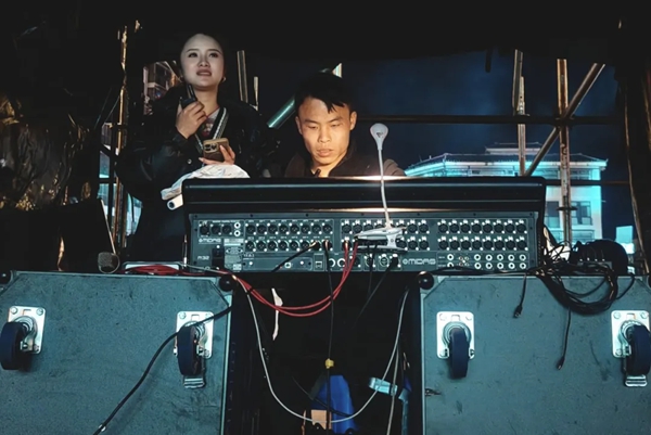 吴家佳(左)在黎平县2026年“贵州村歌”百村歌唱大赛直播后台工作。(记者 余天英 摄)