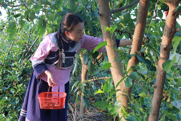 在龙坪镇云盘村的幸福桑葚采摘园,翠绿的桑林间挂满紫红诱人的果实,果香扑鼻。果农穿梭其间,熟练地采摘供应市场;游客们提着果篮穿梭采摘,随手品尝鲜果,大家边采边拍、欢声笑语不断,尽享田园乐趣。