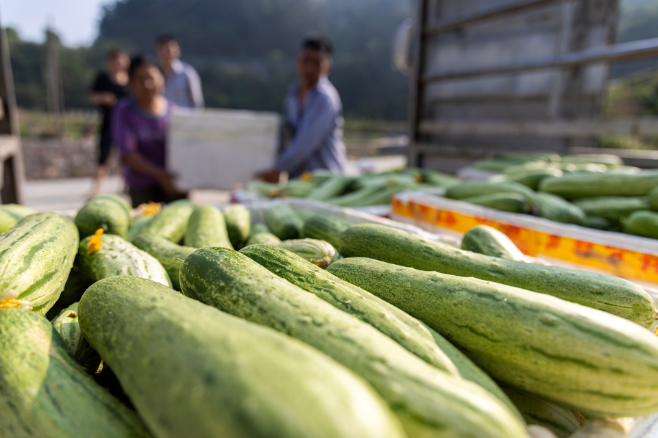 收购商在蔬菜种植基地装运黄瓜 摄影 史传鸿