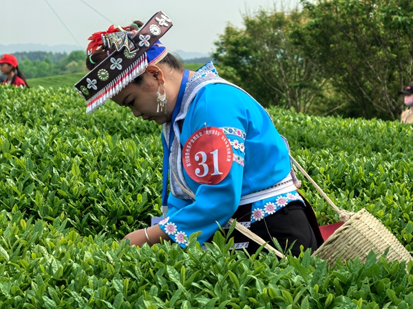 4月19日,本届茶博会配套活动——“贵州绿茶杯”双手采茶技能竞赛决赛在湄潭中国茶海开赛。赛事既是采茶技艺的专业竞技,更是展示茶乡生态风貌、弘扬黔茶文化的重要窗口。放眼万亩茶海,4.3万余亩茶园碧波绵延、绿意浩荡,来自全省10支代表队的40名采茶能手齐聚赛场,腰系茶篓、十指翻飞,在茶树嫩芽间灵巧采摘,鲜嫩芽叶精准入篓、井然有序。